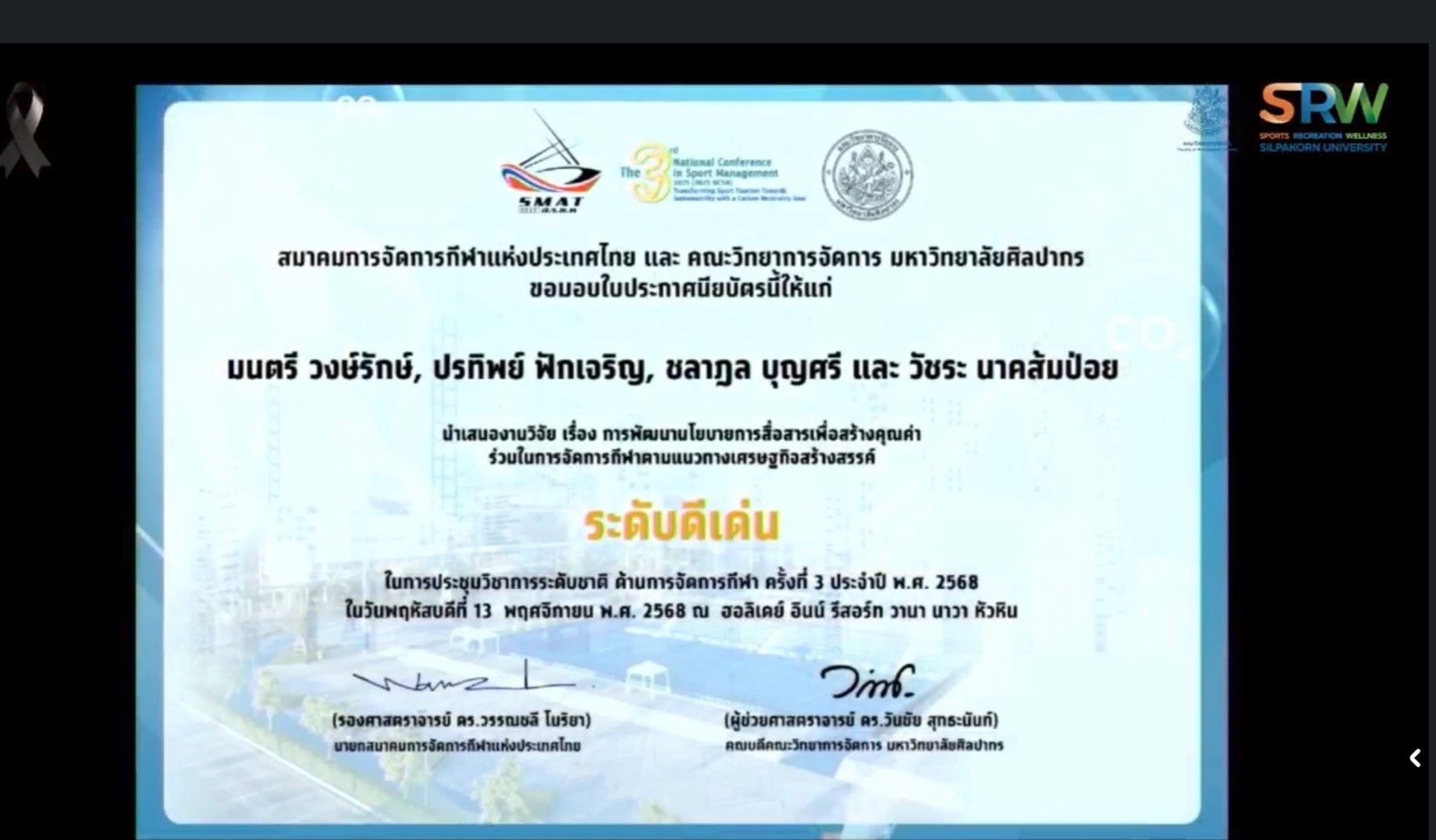 ภายใต้หัวข้อหลัก “Transforming Sport Tourism Towards Sustainability with a Carbon Neutrality Goal” จัดขึ้น ณ โรงแรมฮอลิเดย์ อินน์ วานา หัวหิน จังหวัดประจวบคีรีขันธ์