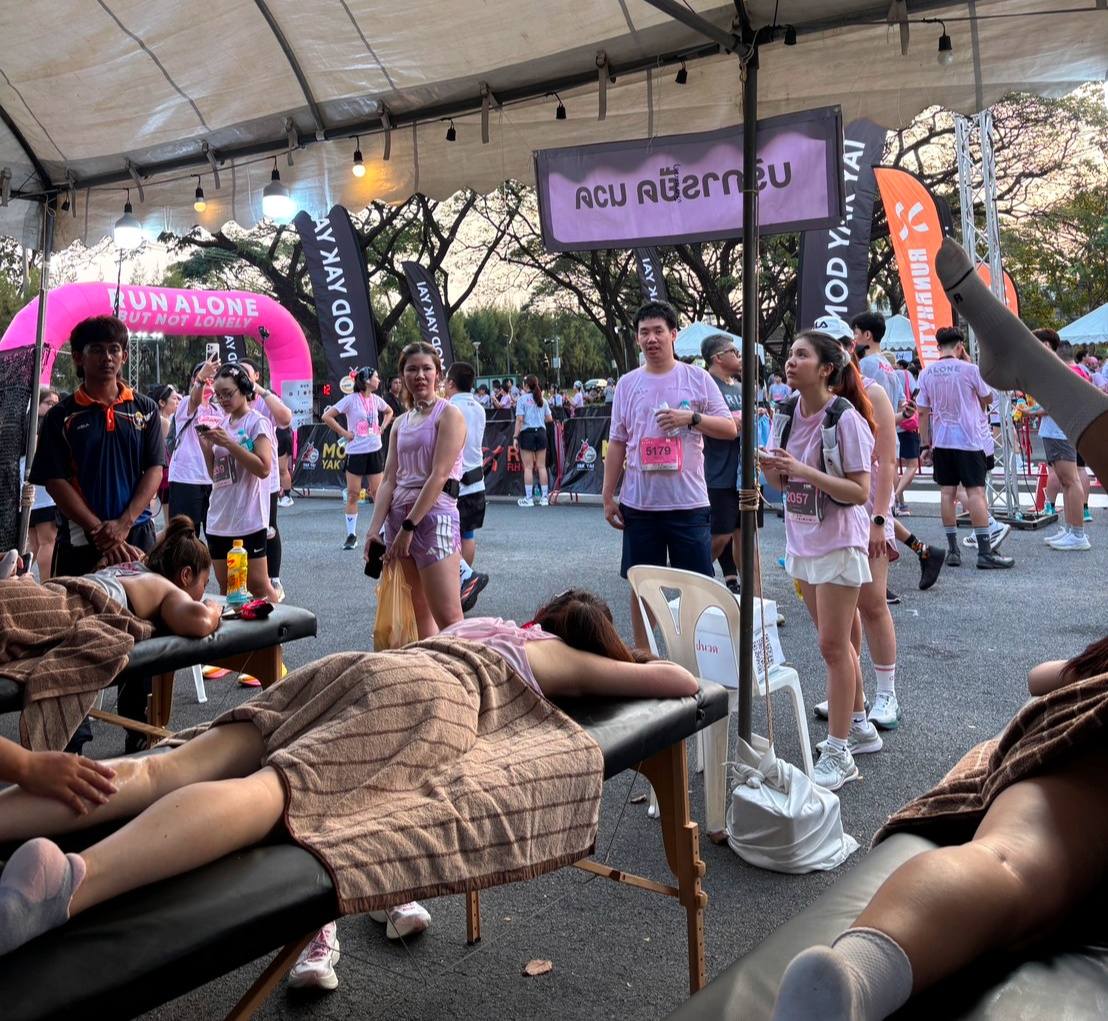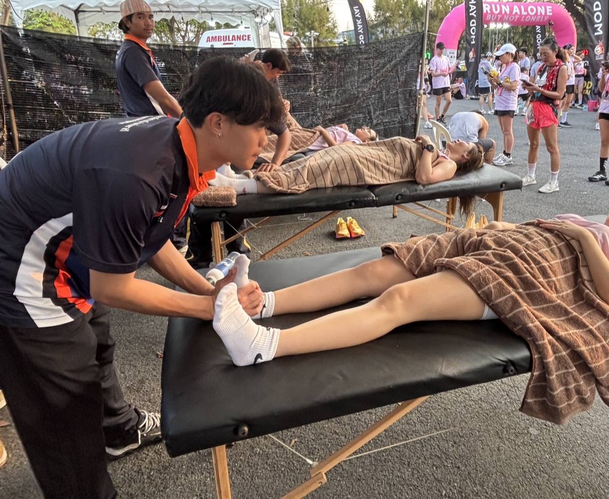 นายบรรณากิจบรรจง ทองจำปา รองอธิการบดีมหาวิทยาลัยการกีฬาแห่งชาติ ประจำวิทยาเขตกรุงเทพ มอบหมายให้ อาจารย์วสิฐ สุโกศล รองคณบดีคณะวิทยาศาสตร์การกีฬาและสุขภาพ นำนักศึกษาออกให้บริการวิชาการด้านการนวดคลายกล้ามเนื้อแก่ผู้เข้าร่วมกิจกรรมวิ่งมาราธอน 𝗥𝗨𝗡 𝗔𝗟𝗢𝗡𝗘 … 𝗕𝗨𝗧 𝗡𝗢𝗧 𝗟𝗢𝗡𝗘𝗟𝗬 𝟮𝟬𝟮𝟲 เพื่อส่งเสริมสุขภาพของนักกีฬาและประชาชนทั่วไป โดยกิจกรรมดังกล่าวเป็นการเปิดโอกาสให้นักศึกษาได้นำองค์ความรู้และทักษะทางวิชาชีพด้านวิทยาศาสตร์การกีฬาไปประยุกต์ใช้จริง พัฒนาความพร้อมก่อนเข้าสู่สายอาชีพ